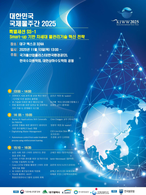 Korea Water Cluster, một khu công nghiệp được chính phủ hỗ trợ tại Daegu, sẽ tổ chức một phiên họp đặc biệt về công nghệ quản lý nước thế hệ tiếp theo vào thứ năm trong Tuần lễ nước quốc tế Hàn Quốc (KIWW) 2025 tại EXCO ở Daegu.