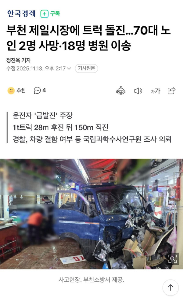 Theo Đồn Cảnh sát Ojeong Bucheon ngày 13, vào lúc 10 giờ 55 phút sáng cùng ngày, một chiếc xe tải 1 tấn đã lao lên vỉa hè trong khu vực chợ Jeil tại phường Wonjong, quận Ojeong, thành phố Bucheon. Vụ tai nạn khiến hai phụ nữ ngoài 70 tuổi tử vong, và tổng cộng 20 người — bao gồm 18 người bị thương từ nhẹ đến nặng — đã được đội cứu hộ 119 đưa đi bệnh viện.