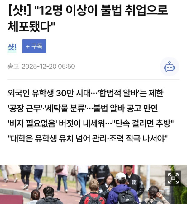 Bắt 12 du học sinh và phạt ít nhất 2 triệu won vì lao động bấ.t hợ.p ph.áp. 페이지 정보 작성자 Meocon 작성일 2025.12.22 16:38 분류 Hàn Quốc 42 조회 목록 본문 Bắt 12 du học sinh và phạt ít nhất 2 triệu won vì lao động bấ.t hợ.p ph.áp. SNS 공유 신고 차단 댓글 0 로그인한 회원만 댓글 등록이 가능합니다. 이전글 다음글 목록