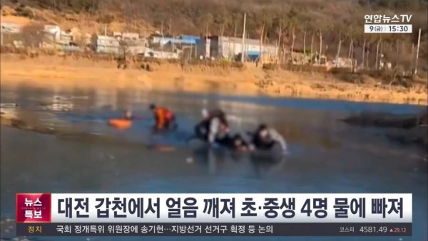 4 học sinh tiểu học và trung học đã rơi xuống nước sau khi băng vỡ ở suối Gapcheon, thành phố Tại 대전... đã được lực lượng cứu hộ cứu kịp thời.