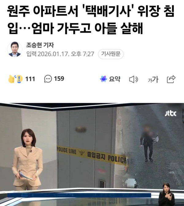 Tại Wonju (Hàn Quốc), một nam thanh niên ngoài 20 tuổi giả danh shipper để đột nhập vào căn hộ, khống chế và giam giữ người mẹ ngoài 70 tuổi, sau đó dùng hu.ng k.hí sá.t h ại con trai 40 tuổi khi nạn nhân trở về nhà. Nghi phạm bị bắt khẩn cấp sau khi tự báo án và sẽ bị xin lệnh bắt giữ với tội g.iết người.