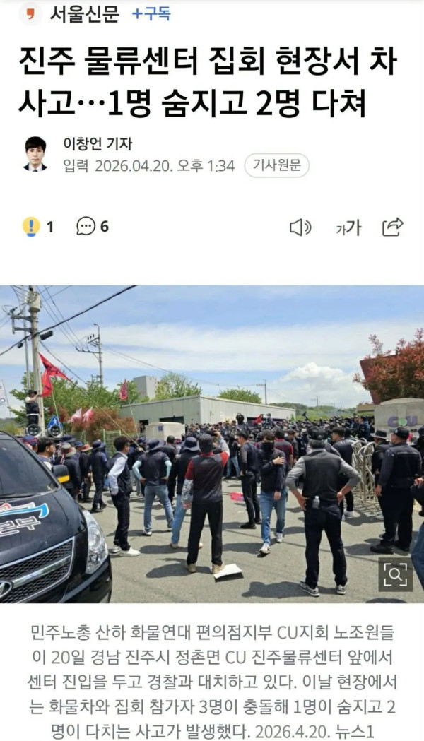 Sáng ngày 20/4, một xe tải chở hàng đã đâm vào các thành viên công đoàn tại điểm tập trung biểu tình trước một trung tâm logistics ở Jinju, tỉnh Nam Gyeongsang, khiến một người ch,ết và hai người bị th,ương.