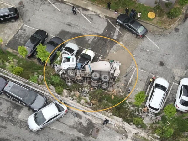 “Một vụ t:ai n:an đã xảy ra khi xe trộn bê tông đ:â:m vào tường chắn ven đường rồi r:ơi xuống... khiến tài xế bị thương và một số phương tiện đỗ tại bãi đỗ xe ngoài trời của chung cư bị h:ư h:ỏng nặng.