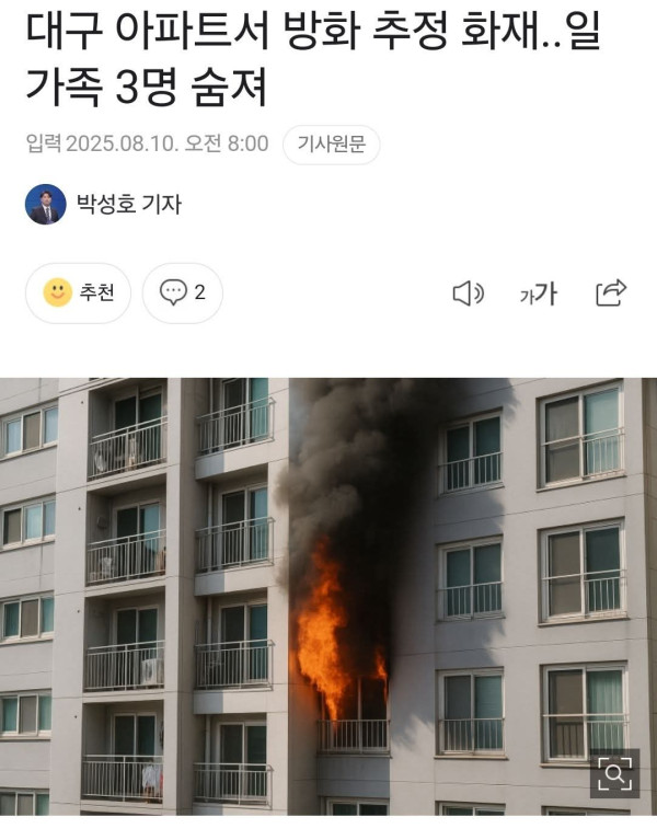 Sáng nay cháy tại một căn hộ ở Daegu khiến 1 gia đình 3 người t,hiệt m,ạng