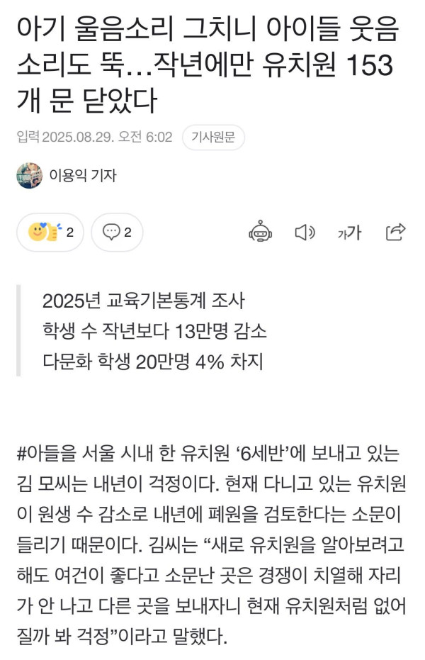 Số trẻ em Hàn Quốc tiếp tục giảm sâu, khiến nhiều trường mầm non buộc phải ngừng hoạt động. Theo Thống kê giáo dục 2025, chỉ trong năm qua đã có 153 trường mầm non đóng cửa, số học sinh từ mầm non đến THPT giảm thêm 13 vạn em, xuống còn 5,55 triệu – chỉ bằng một nửa so với 20 năm trước.