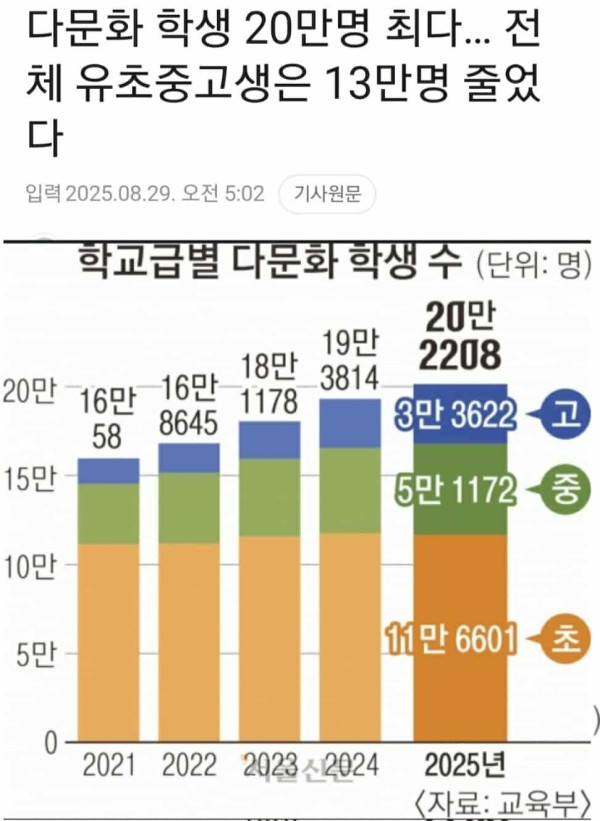 HỌC SINH ĐA VĂN HÓA ĐẠT MỨC KỶ LỤC 200.000 EM. NHƯNG HỌC SINH MẪU GIÁO TIỂU HỌC VÀ TRUNG HỌC HÀN QUỐC GIẢM HƠN 130.000 EM TRONG MỘT NĂM