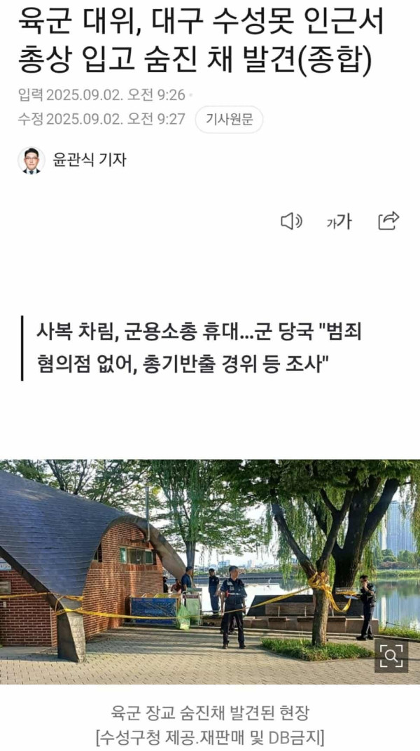 Quân đội và cảnh sát đã mở cuộc điều tra sau khi một đại úy Lục quân được phát hiện thi thể mặc thường phục trong tình trạng bị b,ắn gần Hồ Suseongmot, một khu nghỉ dưỡng nổi tiếng ở trung tâm thành phố Daegu.