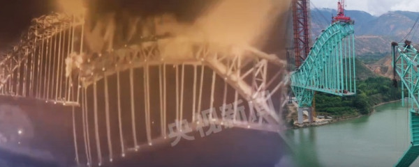 Hình ảnh do Tân Hoa Xã công bố cho thấy phần lớn kết cấu vòm cầu đã biến mất, mặt cầu bị gãy cong rồi cắm thẳng xuống dòng Hoàng Hà.