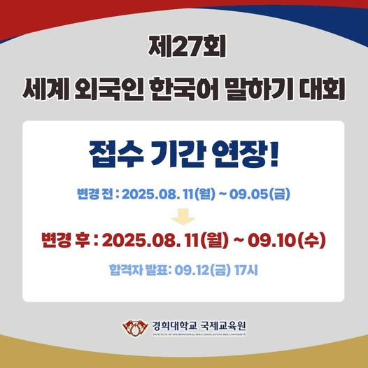 Đại học Kyung Hee vừa thông báo chính thức về việc gia hạn thời gian đăng ký tham gia Cuộc thi Nói tiếng Hàn dành cho người nước ngoài lần thứ 27.