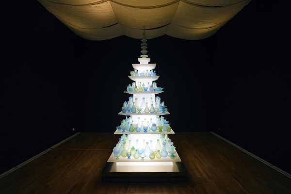 Gần đó, 250 chiếc bình thủy tinh thổi thủ công của Park Seon-min lấp lánh như những lễ vật ánh sáng. Được mô phỏng theo những chiếc bình và bát La Mã từng được vận chuyển trên Con đường Tơ lụa đến Vương quốc Silla, chúng nằm trên một ngôi chùa rực rỡ.