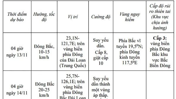 Theo Trung tâm Dự báo KTTV Quốc gia, vào hồi 4h ngày 12/11, vị trí tâm bão ở vào khoảng 21,3 độ Vĩ Bắc; 119,3 độ Kinh Đông, trên vùng biển phía Đông Bắc của khu vực Bắc Biển Đông. Sức gió mạnh nhất vùng gần tâm bão mạnh cấp 9 (75-88km/giờ), giật cấp 11. Di chuyển theo hướng Đông Bắc, tốc độ 10-15km/h.