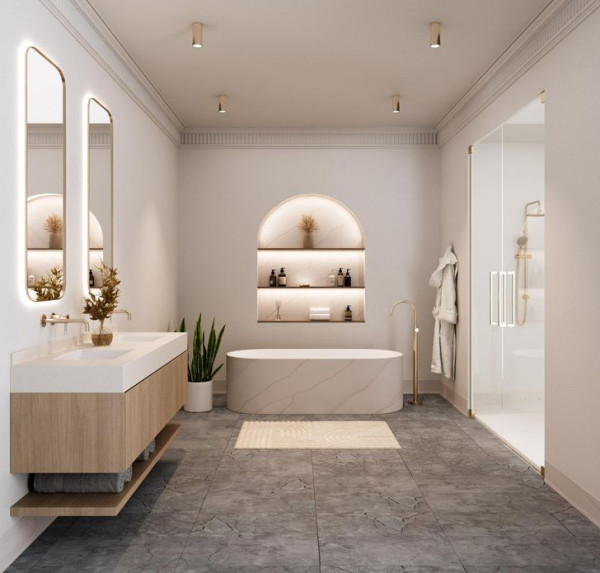 Tạp chí BUILDINGS đã vinh danh đá cẩm thạch nhân tạo HIMACS Calacatta Albero là lựa chọn hàng đầu cho giải thưởng. Loại gạch này lấy cảm hứng từ bãi cát vàng óng của Andalusia, phản chiếu vẻ đẹp ấm áp của nó, tạo nên vẻ đẹp tự nhiên cho tủ phòng tắm, tường và bồn tắm.