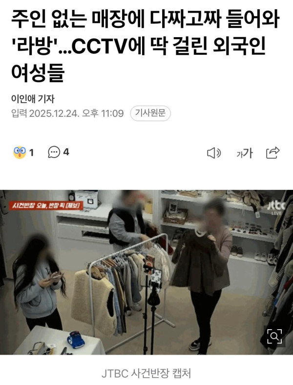 Ba phụ nữ nước ngoài đã tự ý vào một cửa hàng quần áo không người trông coi tại Hàn Quốc, dựng máy quay và livestream giới thiệu sản phẩm như bán hàng online. Sau khi bị quản lý tòa nhà phát hiện, nhóm này nhanh chóng rời đi. Cảnh sát xác nhận họ mang quốc tịch Trung Quốc, Nga và Uzbekistan; vụ việc kết thúc mà không có xử phạt.