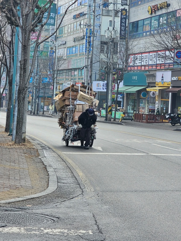 Hình ảnh một cụ ông đang kéo xe giấy cao vút, chắc hôm nay cụ lượm được nhiều hơn mọi khi... nên có vẻ bước c:hân cũng n:ặng hơn...