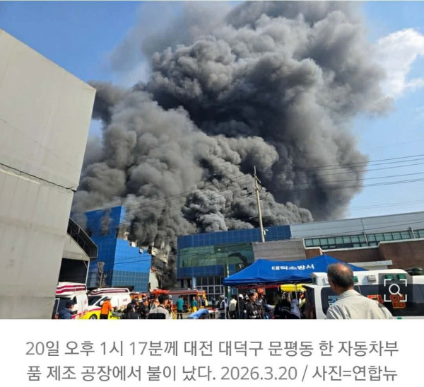 Vụ cháy xảy ra vào khoảng 13h17 hôm nay (ngày 20/3) tại một nhà máy sản xuất phụ tùng ô tô ở Munpyeong-dong, Daedeok-gu, Daejeon ( 대전 대덕구 문평동)