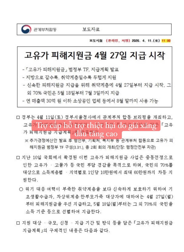 Chính phủ Hàn Quốc đã chính thức công bố kế hoạch hỗ trợ nhằm giảm gánh nặng do giá xăng dầu và vật giá tăng cao.