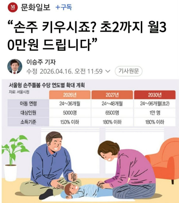 TẠI SEOUL ÔNG BÀ CHĂM SÓC NUÔI DẠY CHÁU SẼ ĐƯỢC CHÍNH PHỦ HÀN QUỐC HỖ TRỢ 300.000WON MỖI THÁNG CHO ĐẾN KHI TRẺ EM ĐẾN LỚP 2.