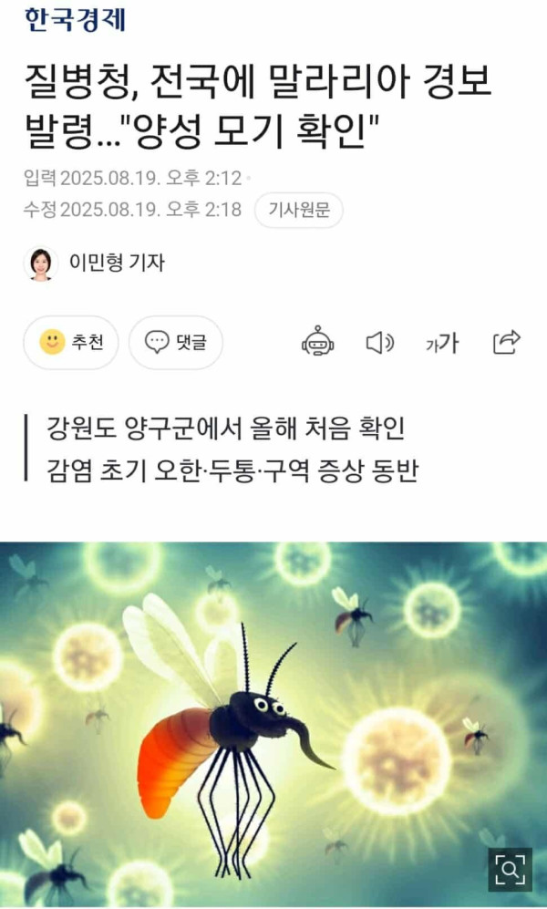 Cơ quan quản lý dịch bệnh Hàn Quốc (KDCA) ngày 19/8 đã ban cảnh báo sốt rét trên phạm vi toàn quốc lần đầu tiên trong năm nay sau khi phát hiện ký sinh trùng sốt rét Plasmodium trong loài muỗi trung gian truyền bệnh (muỗi Anopheles).
