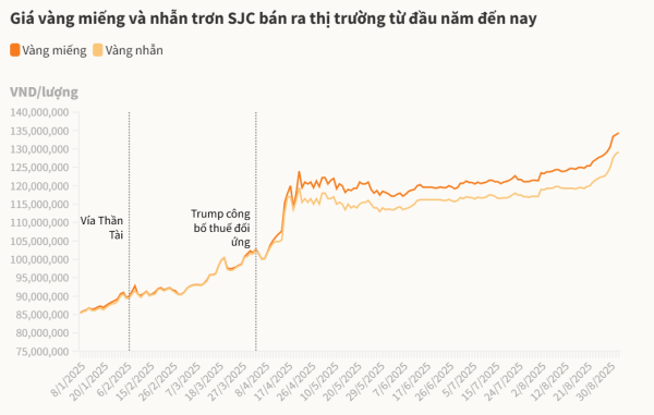 SJC niêm yết ở mức 132,9 – 134,4 triệu đồng/lượng, tăng 500.000 đồng so với hôm qua, mức cao nhất từ trước đến nay.