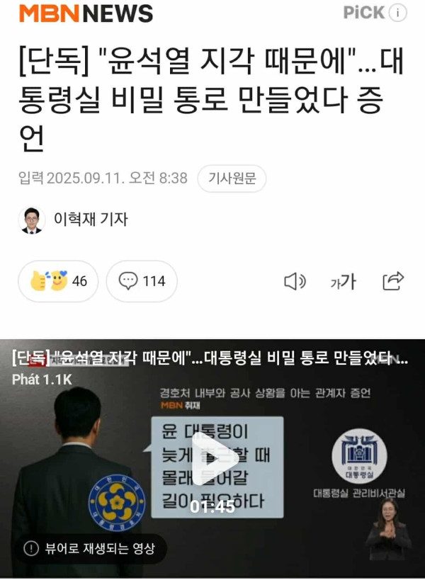 TT 윤석열 HAY ĐI LÀM MUỘN NÊN VĂN PHÒNG TỔNG THỐNG ĐÃ DÙNG HÀNG TRĂM TRIỆU WON XÂY LỐI ĐI RIÊNG BÍ MẬT. MBN vừa công bố lời chứng mới cho thấy trong giai đoạn đầu chính quyền 윤석열, Văn phòng Tổng thống cù...