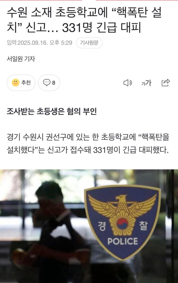 Theo Công an quận Gwonseon, thành phố Suwon, vào lúc 11 giờ 22 phút ngày 16, trên trang web Trung tâm báo cáo an toàn 119 đã có thông báo: “Đã cài đặt b0m hạ.t nhân tại trường tiểu học A”.