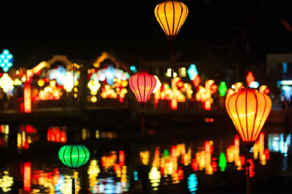 Ban đêm: Cảnh đèn lồng phản chiếu trên mặt nước cùng tiếng nhạc du dương tạo cảm giác bình yên, lãng mạn và huyền bí.
