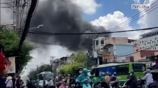 Kho chứa hàng trong hẻm 491 Trường Chinh, TP.HCM bất ngờ bốc cháy, khói đen cuồn cuộn bao trùm khu vực, khiến người dân và tiểu thương chợ Võ Thành Trang hốt hoảng tháo chạy.