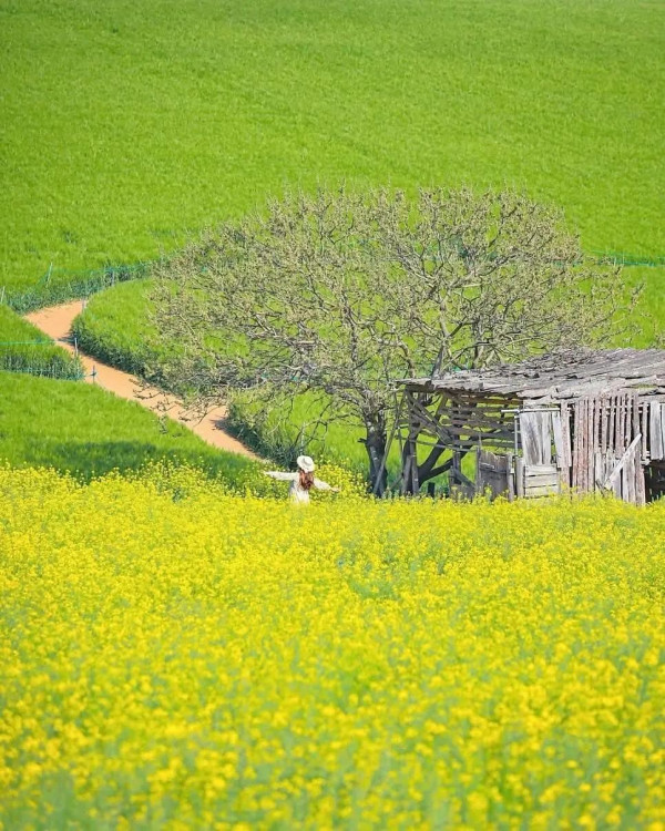 1 cánh đồng toàn hoa cải và lúa mạch, đi hít thở không khí trong lành tự nhiên mùi hoa và mùi lúa.